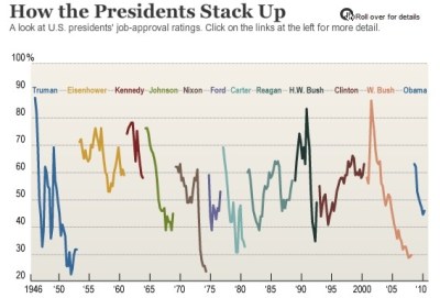 The Wall Street Journal has a chart illustrating the pattern of high approval rating for incoming U.S. presidents followed, almost invariably, by disappointment. Bill Clinton seems the only clear exception to this pattern since WWII.