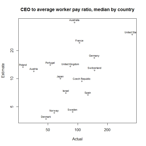 Interestingly, not only do median estimates of the pay ratio in all countries grossly underestimate the true values, but there is essentially not correlation between the two (R2 = 14%, 3.5% after dropping the U.S. outlier):