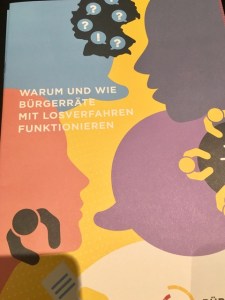 This was a civil society initiative prompted by the “Grand Coalition” [GroKo] agreement between the SPD and CDU/CSU. Article 13 (pg 136) of that agreement includes a promise to research (via an expert commission) the possibility that “our precious representative parliamentary democracy could be completed with elements of direct democracy or citizen participation.” Nearly two years later, that expert commission has still not even begun to materialize. Seizing the opportunity, a civil society initiative called Mehr Demokratie (more democracy) raised money and organized this even in “four phases” with the help of two institutes that run participatory fora for local and regional governments and organizations: Nexus and Ifok. Of high interest to “sortinistas” will be this brochure about “Losverfahren” (procedure by lot) also handed out to the participants last Saturday at the end of the assembly.