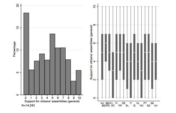 A new paper in the European Journal of Political Research (full text) provides data about popular support for allotted citizens’ assemblies in Western Europe. The countries surveyed were: Austria, Belgium, Denmark, Finland, France, Germany, Greece, Italy, Ireland, Netherlands, Norway, Portugal, Spain, Sweden, and the UK.