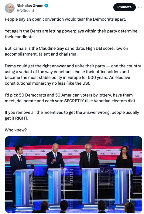 People say an open convention would tear the Democrats apart.Yet again, the Dems are letting powerplays within their party determine their candidate. But Kamala is the Claudine Gay candidate. High DEI score, low on accomplishment, talent and charisma. Dems could get the right answer and unite their party — and the country using a variant of the way Venetians chose their officeholders and became the most stable polity in Europe for 500 years. An elective constitutional monarchy no less (like the US). I’d pick 50 Democrats and 50 American voters by lottery, have them meet, deliberate and each vote SECRETLY (like Venetian electors did). If you remove all the incentives to get the answer wrong, people usually get it RIGHT. Who knew?